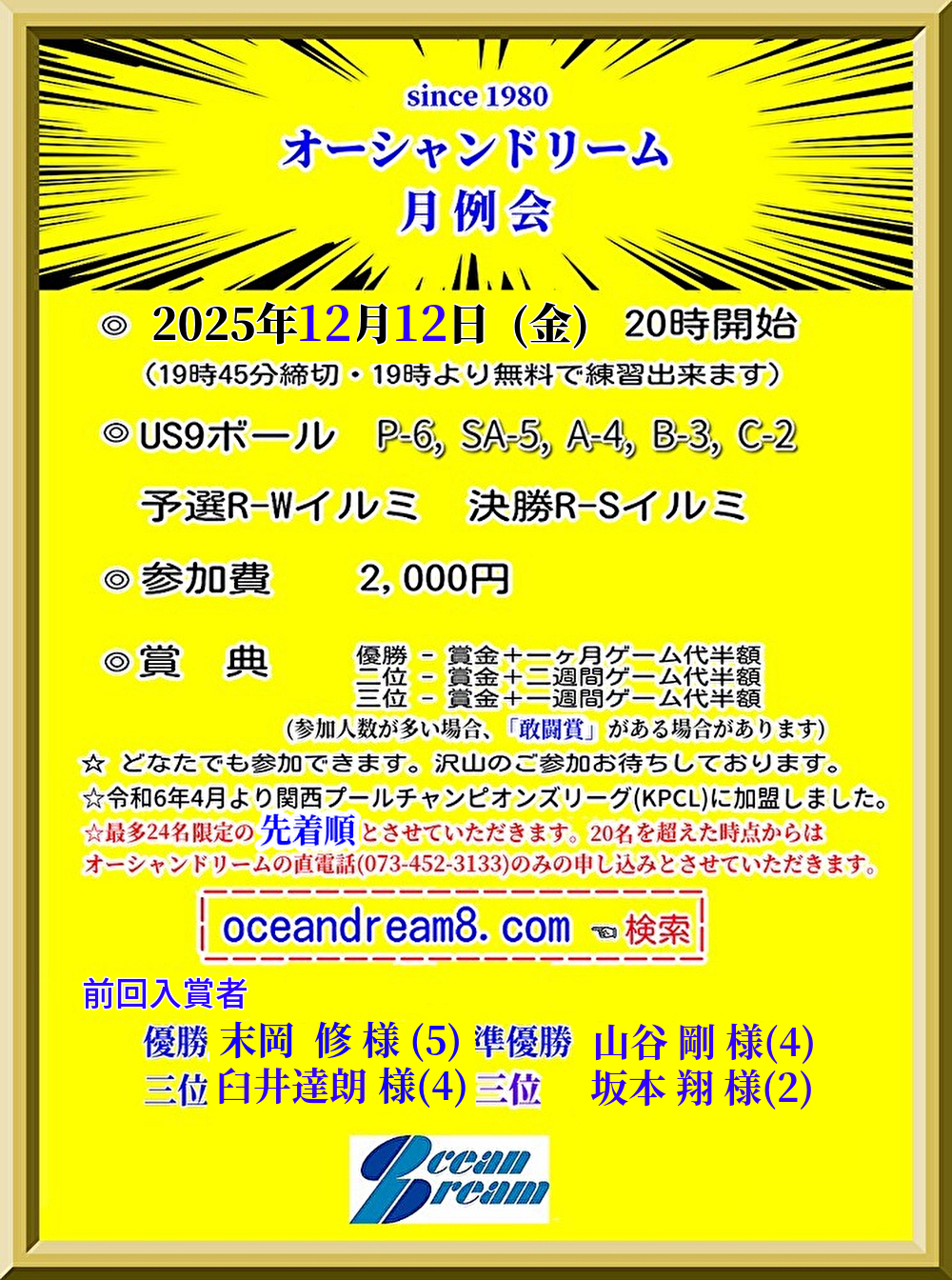 2025年11月19日 / 最終更新日時 : 2025年11月19日 takemoto お知らせ 【告知・オーシャンドリーム月例会】’25.12.12(金)20時開始 【告知・オーシャンドリーム月例会】’25.12.12(金)20時開始