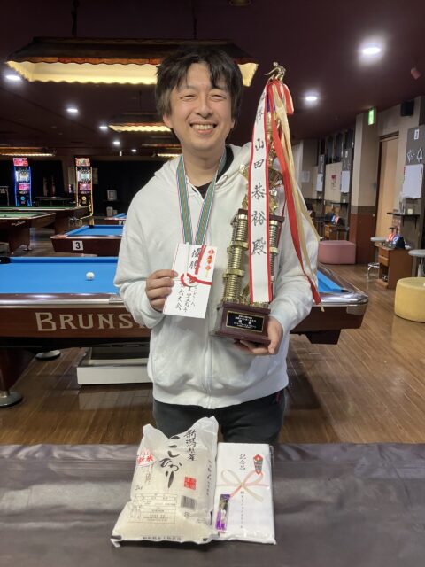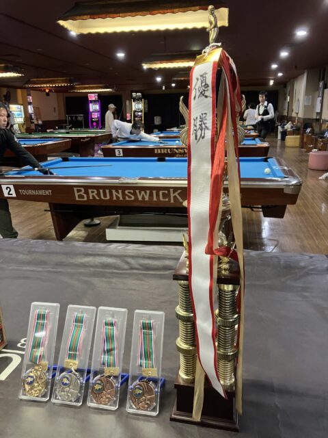 ⁂1980年9月14日「プロの店・ビリヤード竹」として創業、法人化・改名を経て45周年記念大会を盛況のうちに迎えられましたこと、ご協賛頂いた皆様そして何よりご愛顧を頂きましたお客様方に心より厚く御礼申し上げます。試合は最近無双状態の伸び盛り・山田恭裕選手が40周年大会優勝者の和田宗一郎選手をスタートから圧倒し、念願の金メダルとトロフィーをゲットしました。ほぼ皆勤賞での練習が実を結びました。おめでとうございます。その他の皆様も楽しんでいただけたのではないかと自負しております。50周年に向かって頑張って参りますので変わらぬご愛顧のほどよろしくお願いいたします。